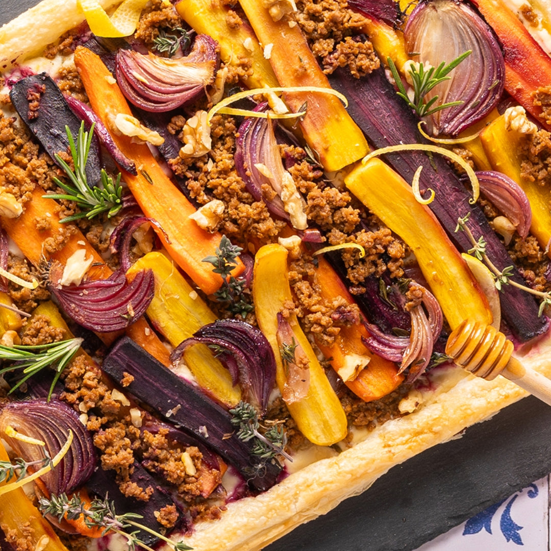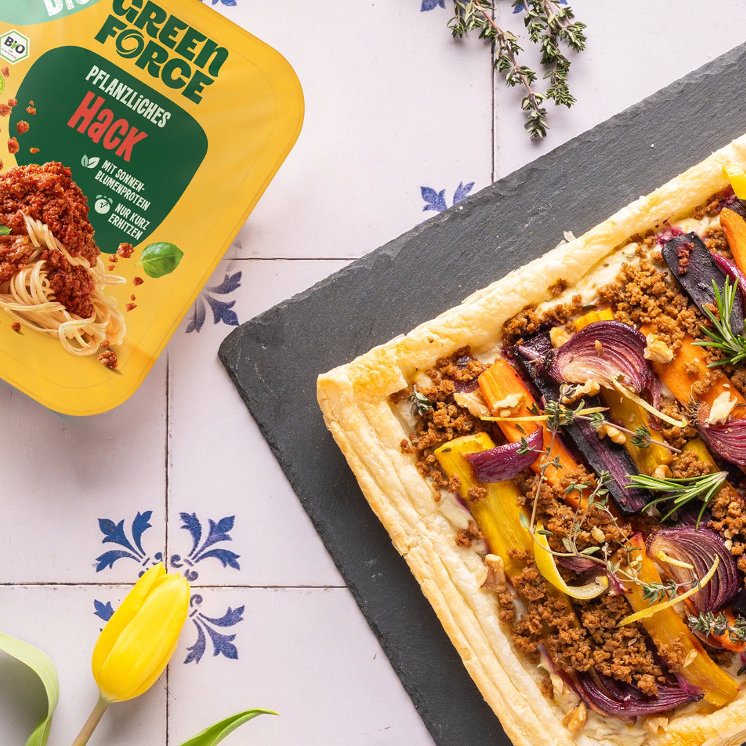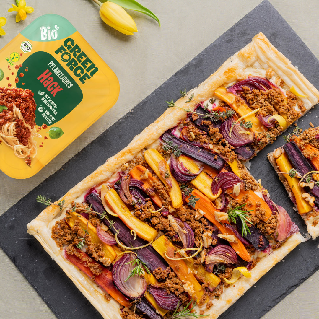 VEGANE BLÄTTERTEIG-TARTE MIT HACK UND ZITRONEN-FETA-CREME