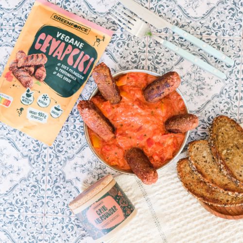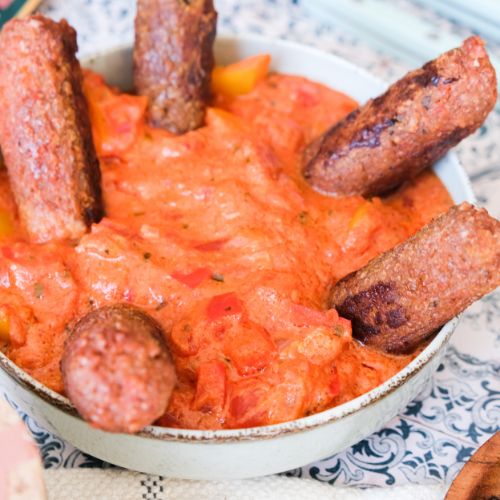 • Vegane Cevapcici auf Paprikarahmgemüse