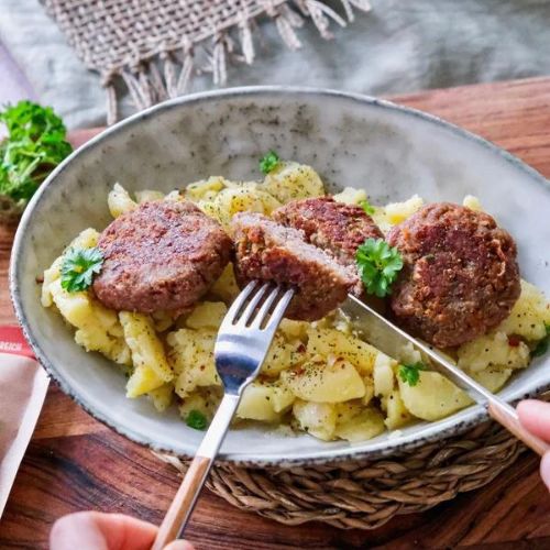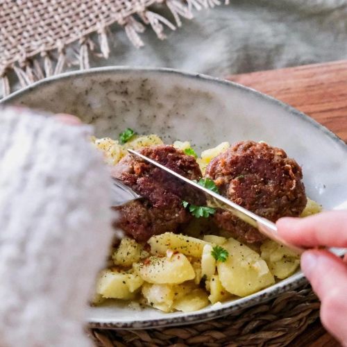 Wer liebt es nicht: Schlicht, einfach und doch so lecker - Frikadellen mit Kartoffelsalat! Geht immer, geht schnell und geht zu 100% vegan. Yummi!