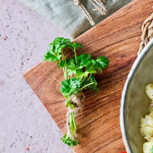 Kartoffelsalat mit Frikadellen und frischer Petersilie anrichten. Genießen!