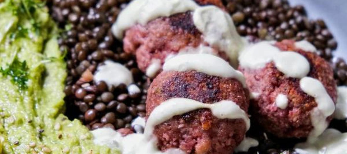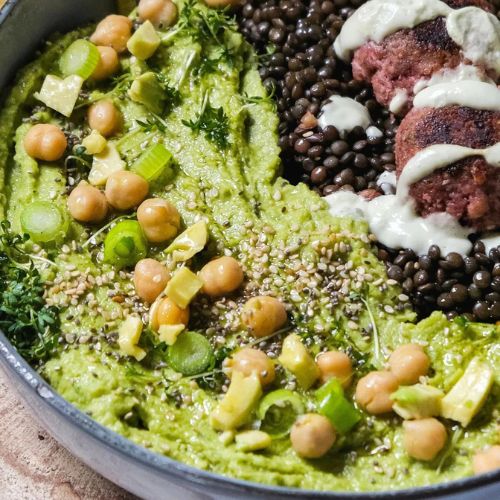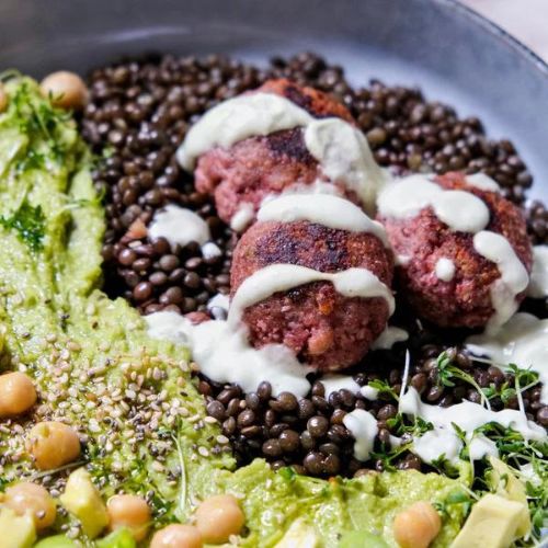• Vegane Frikadellen auf Linsen mit Green Hummus
