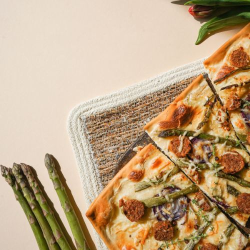 • Frühlings-Flammkuchen mit Spargel und Cevapcici