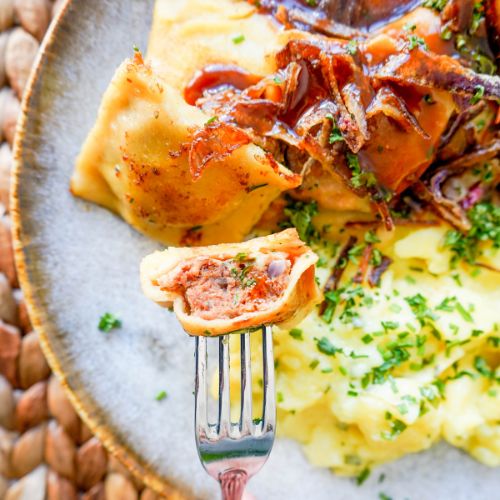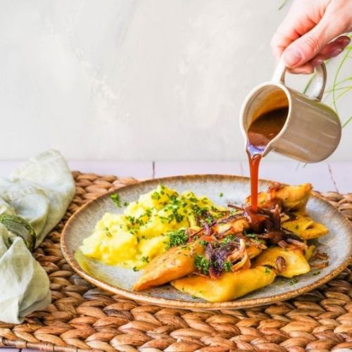 Maultaschen mit Röstzwiebeln, Petersilie anrichten und zum Beispiel mit Kartoffelsalat und veganer Bratensauce genießen.