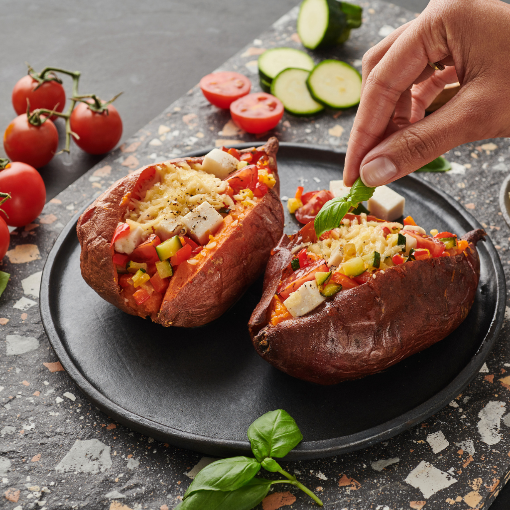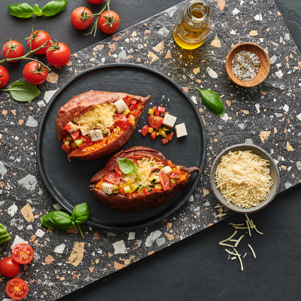Einfach und köstlich: Diese gefüllten Süßkartoffeln mit cremigen Käse-Alternativen und frischem Gemüse bringen in nur 60 Minuten Farbe und Geschmack auf den Tisch. Ideal für ein nahrhaftes, geschmackvolles Abendessen. 🧀