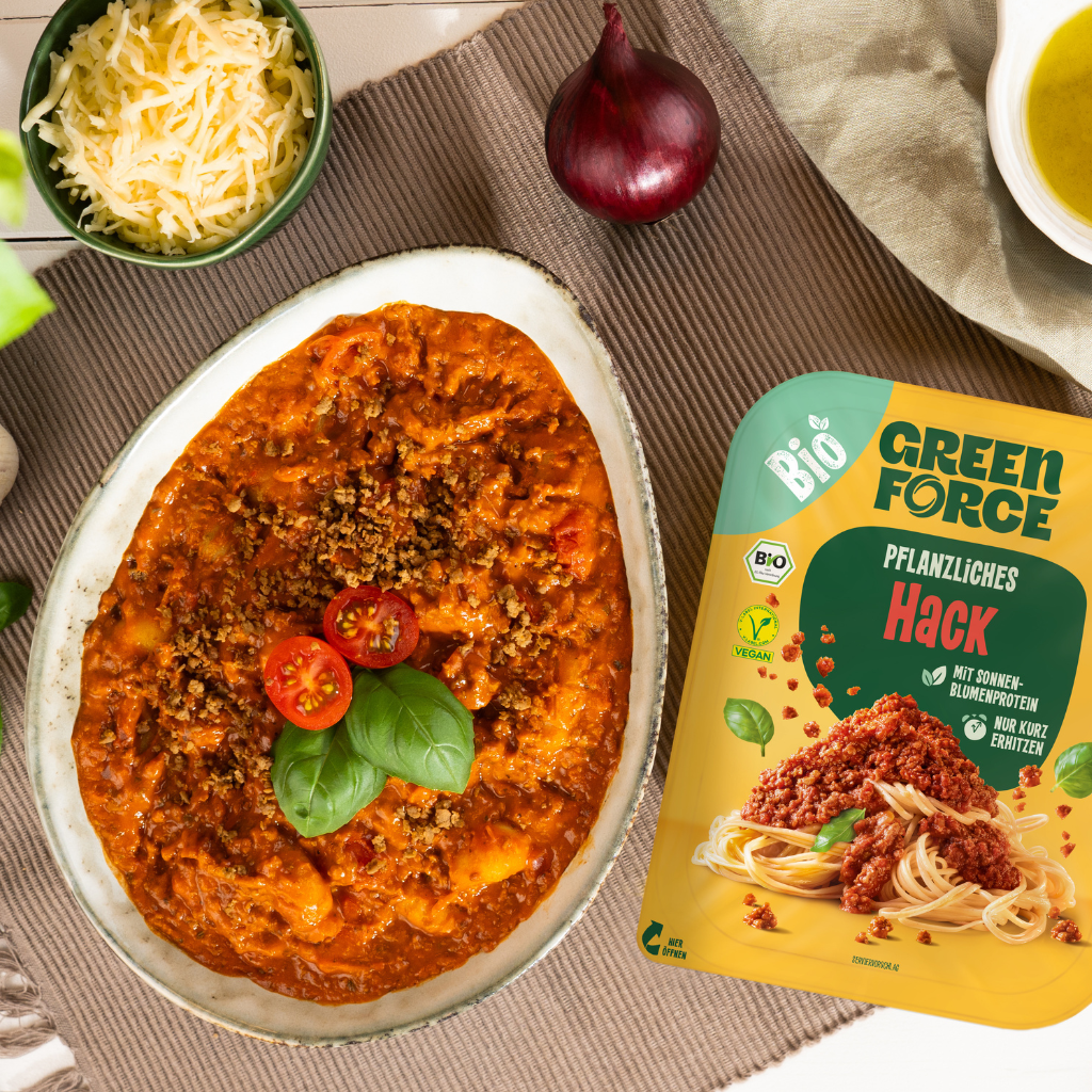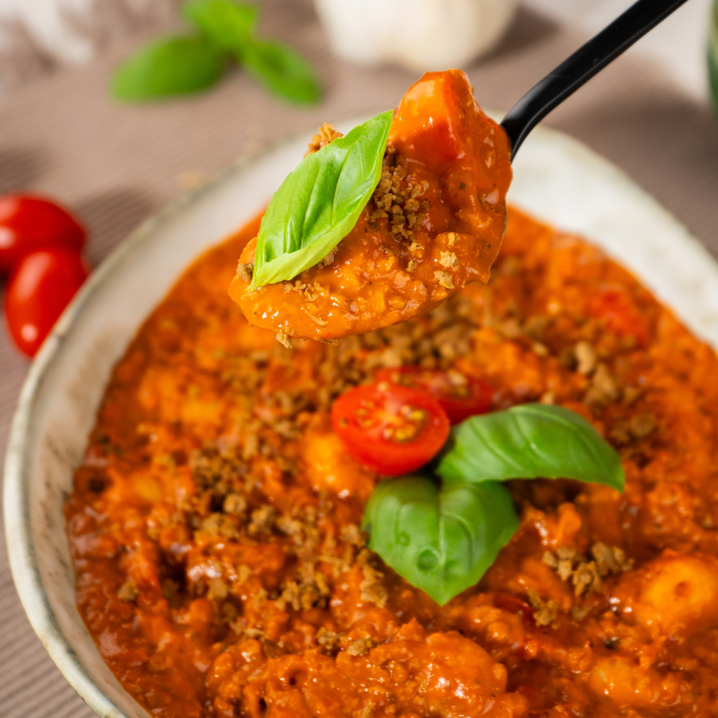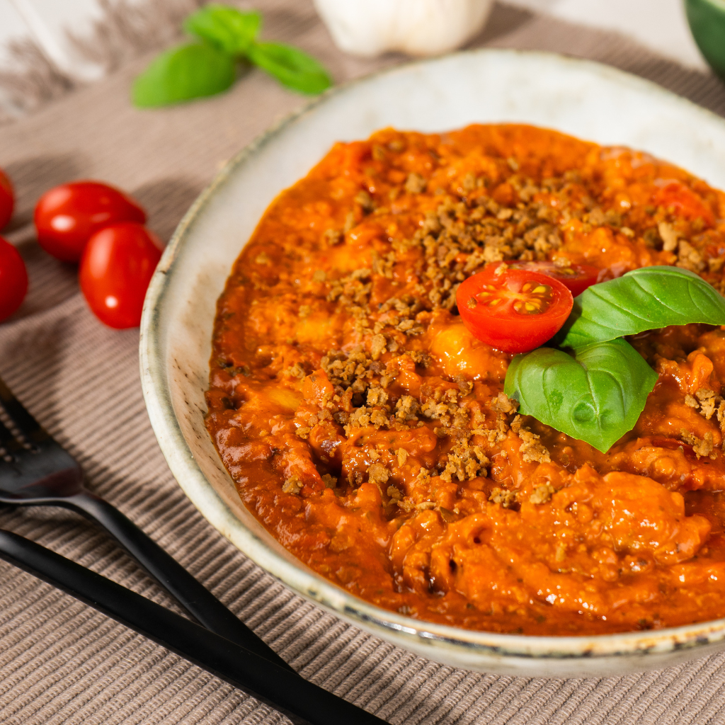 • Überbackene Gnocchi-Pfanne mit pflanzlichem Hack