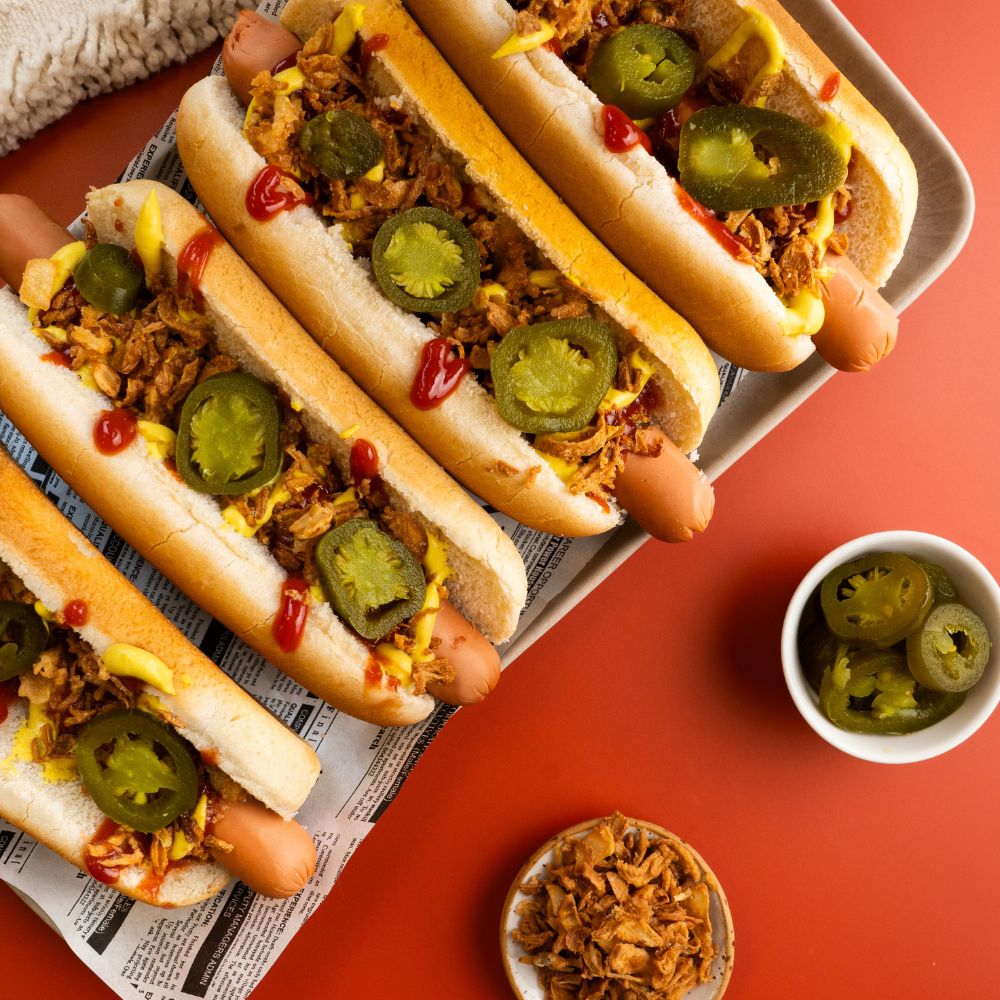 • Platte mit Hot Dogs mit veganen Wienern, getoppt mit Ketchup, Senf, Röstzwiebeln und Jalapenos