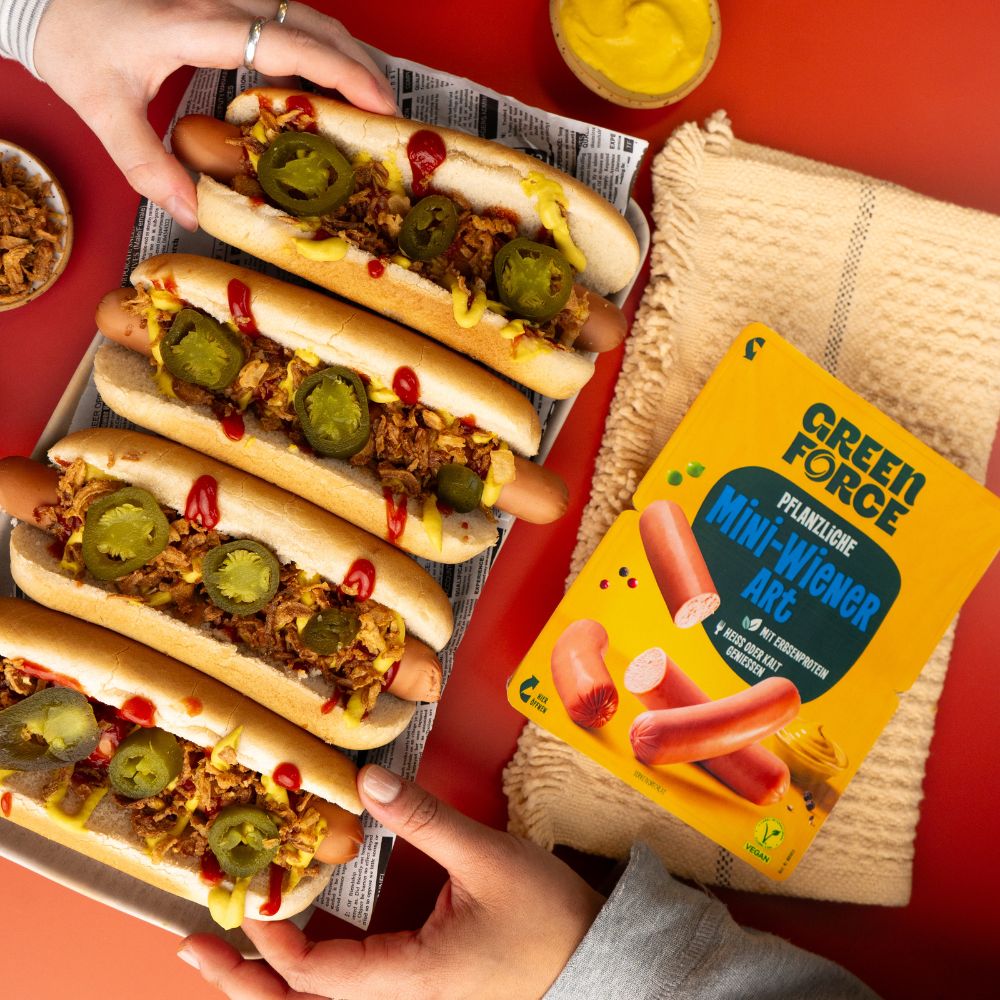 • Zwei Hände greifen sich veganen Hot Dog mit veganen Wienern, Ketchup, Senf, Röstzwiebeln und Jalapenos, daneben liegt die Greenforce Mini Wiener Packung