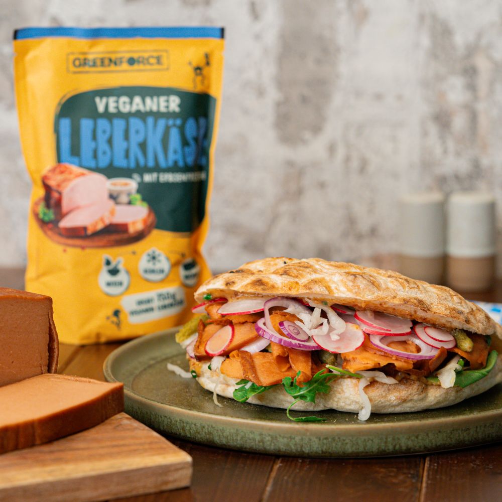 Das Dönerbrot nach Lust und Laune mit Sauce, Leberkäse, Krautsalat, Essiggurken- & Radieschen Scheiben, Zwiebelringen und etwas frischem Feldsalat belegen.