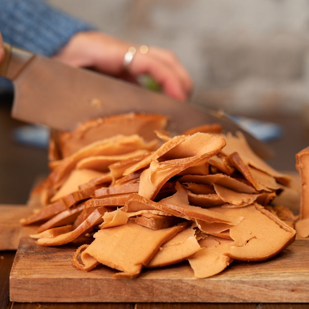 Den gekühlten Leberkäse zu flachen Streifen schneiden.