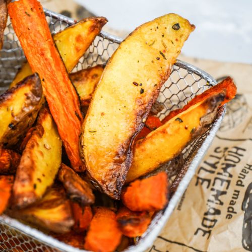 Kartoffeln waschen, Karotten schälen und zu Wedges schneiden. Mit Öl und den Gewürzen vermengen.