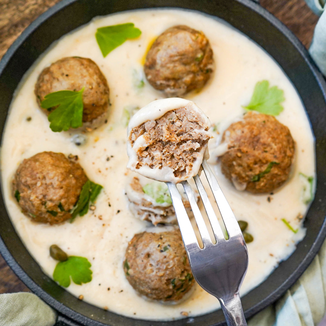 Du liebst Königsberger Klopse? Dann bereite schon einmal alles in der Küche vor, denn wir haben das aus Ostpreußen stammende Gericht zu 100% veganisiert. Unsere Klopse werden traditionell in einer weißen cremigen Kapernsoße serviert. Mhmm ist das gut.