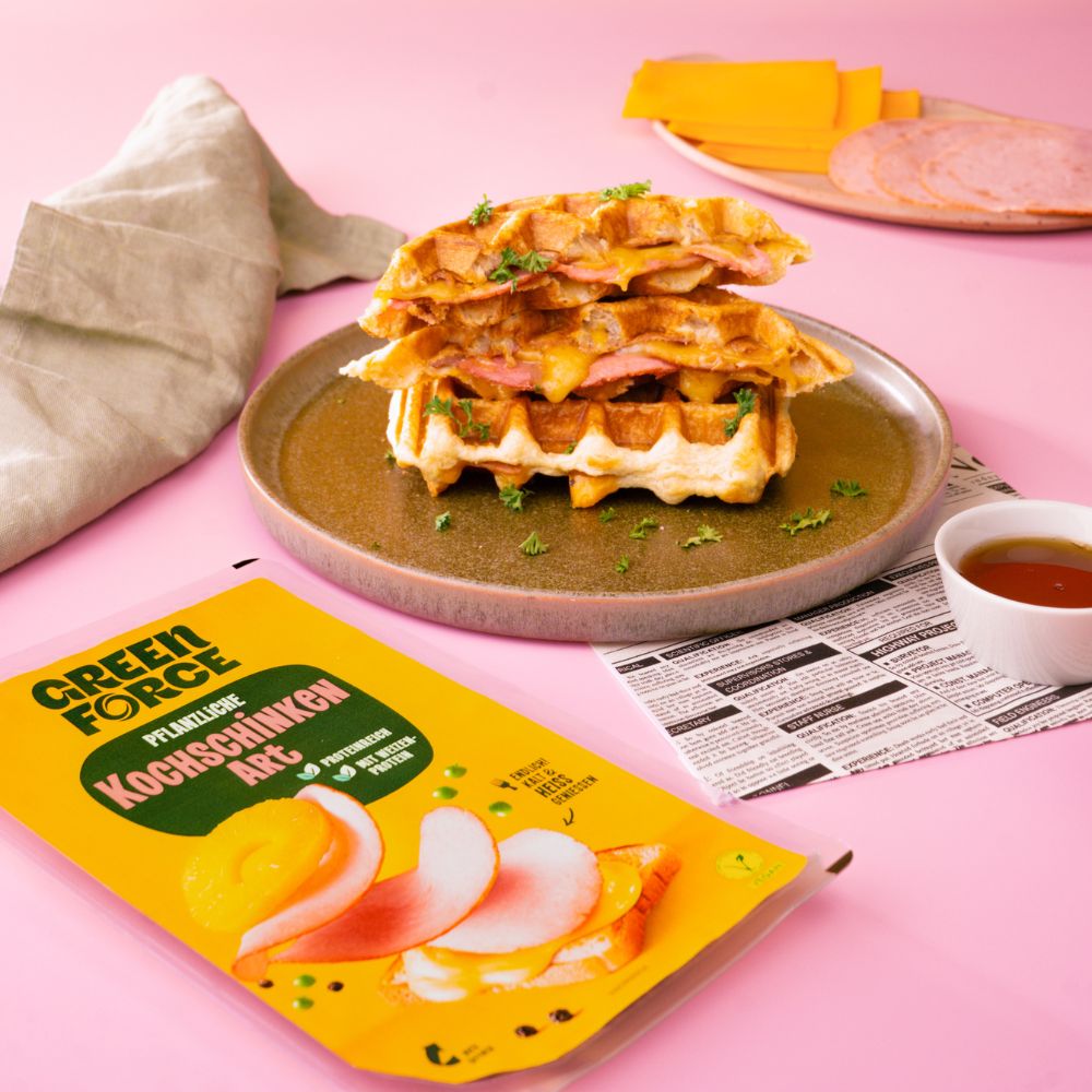 • Vegane Schinken-Käse-Croffles mit Ahornsirup und veganer Greenforce Kochschinken Packung.