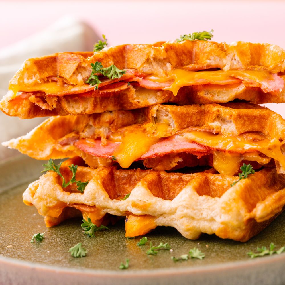 Crispy, savoury, simply brilliant! These vegan ham and cheese croffles combine plant-based buttery croissant dough with tangy cheese and savoury ham – and they're ready in just a few minutes in the waffle iron. Perfect for a quick treat!