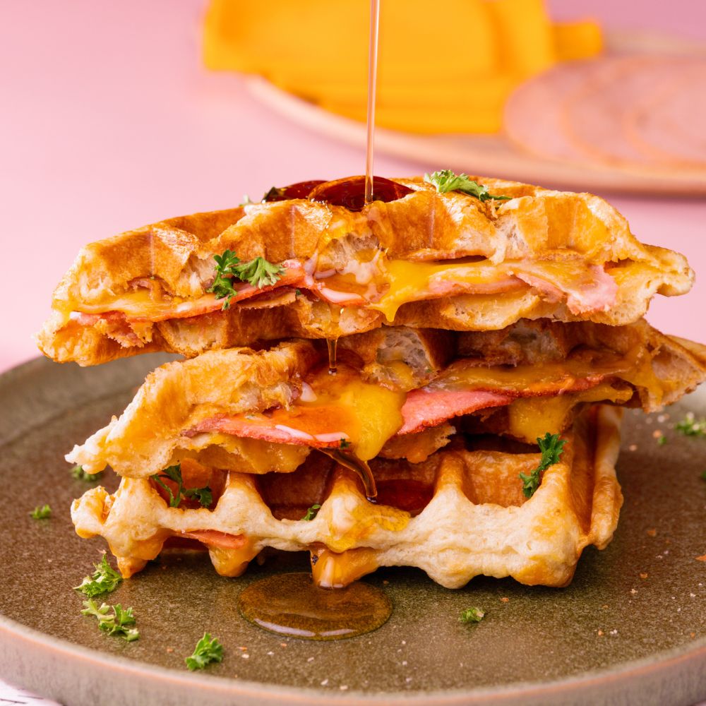• Vegane Schinken-Käse-Croffles werden mit Ahornsirup übergossen.