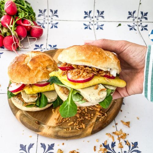 A slightly more unusual recipe is our breakfast roll with our vegan white sausage and vegan egg. Of course, sweet mustard should not be missing here either. We also top the roll with lamb's lettuce, radishes and delicious fried onions. It tastes heavenly. Promised!
