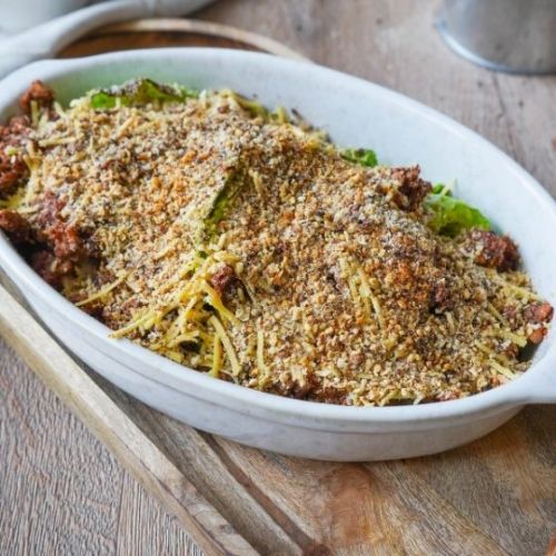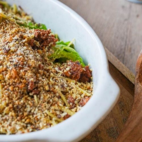 Pour the mince over the savoy cabbage, pour over the cream and cover with the cheese and the crumbs-hazelnut mixture. Finally spread oil over it.