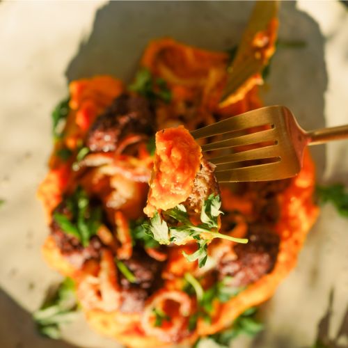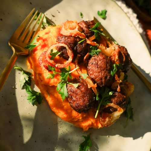 With this Köttbullar recipe we are really competing with Ikea 😉 Not only super tasty, but also completely vegan. The protein-rich Köttbullar on creamy pumpkin and sweet potato mash together with the crunchy onion topping trigger a real food explosion in your mouth 🇸🇪