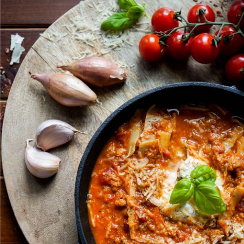 We refine the mince with the Italian spice mixture Ciao Italia and combine it with juicy tomatoes, vegan crème fraîche and lasagna sheets. 💛