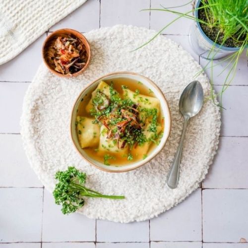 • Vegane Maultaschen-Suppe mit Röstzwiebeln