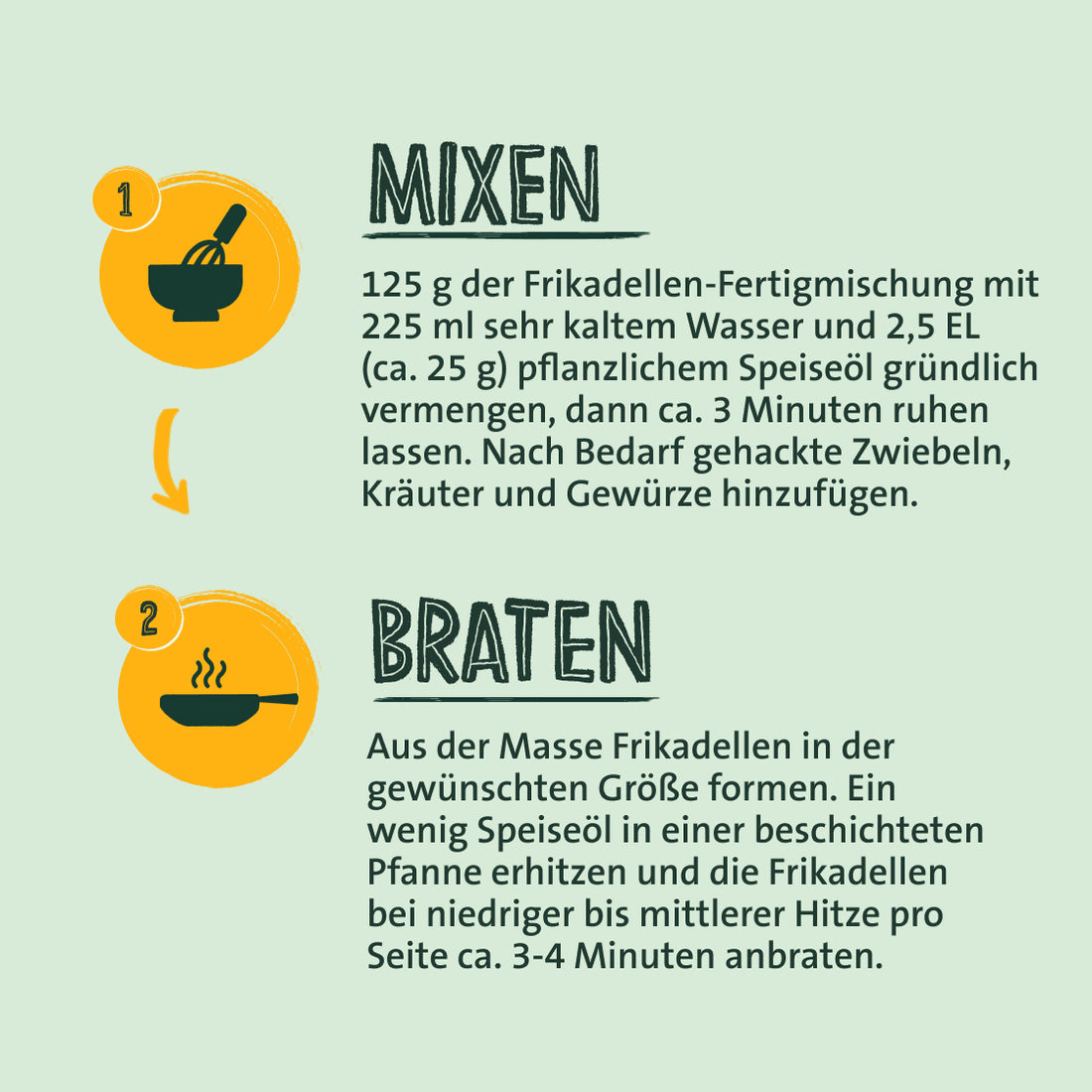 So geht's: Einfach den Mix mit Wasser und einem Schuss Öl anrühren, wie auf unserer Verpackung beschrieben. Forme die Masse zu Frikadellen, brate sie an und erlebe, wie sie außen knusprig und innen saftig werden – ideal als Beilage oder Hauptgericht.