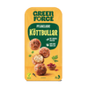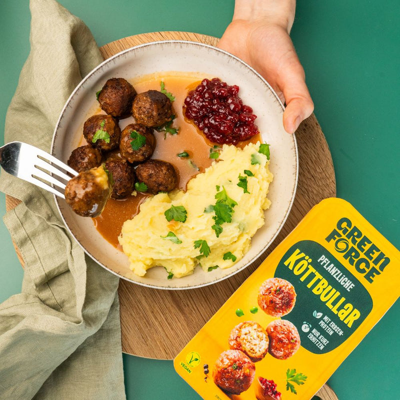 Vegane Köttbullar mit Rahmsoße und Kartoffelbrei im Teller von Person serviert mit Greenforce Köttbullar Packung daneben