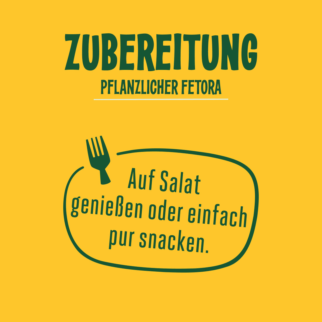 Fetora ist vielseitig einsetzbar – ob als Topping für Salate, in Wraps, auf Pizza oder in warmen Gerichten wie Pasta und Ofengemüse. Er bringt eine angenehm würzige Note und eine leicht krümelige Textur.