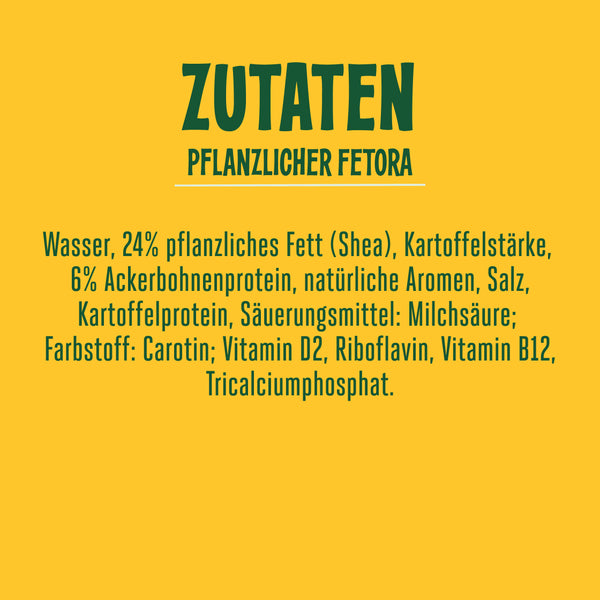 Wasser, 24% pflanzliches Fett (Shea), Kartoffelstärke, 6% Ackerbohnenprotein, natürliche Aromen, Salz, Kartoffelprotein, Säuerungsmittel: Milchsäure; Farbstoff: Carotin; Vitamin D2, Riboflavin, Vitamin B12, Tricalciumphosphat.