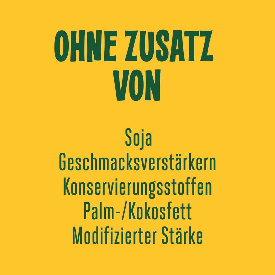 •  Ohne Zusätze von Soja, Geschmacksverstärkern, Konservierungsstoffen, Palm-/ Kokosfett, Modifizierter Stärke