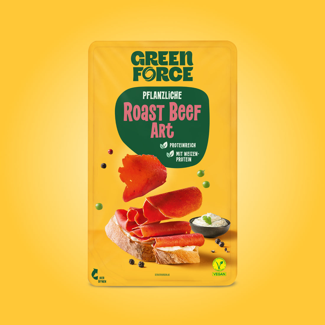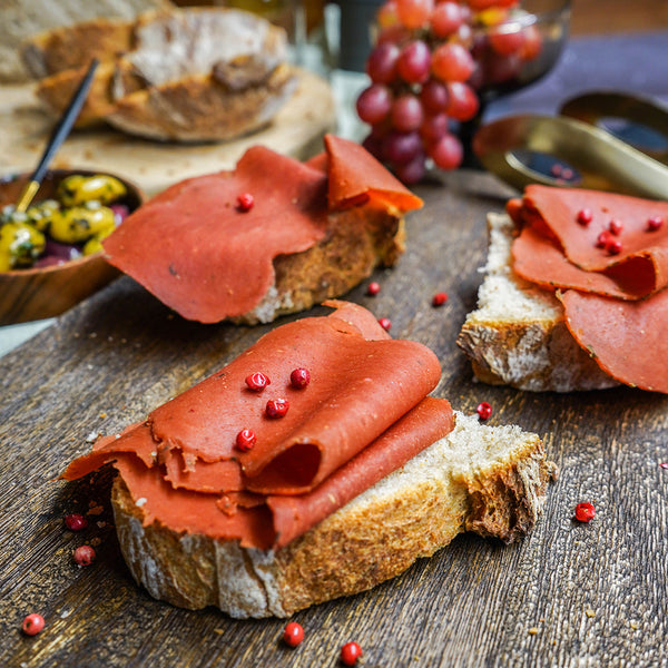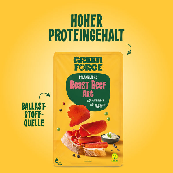 Fein geschnitten, zart im Biss und mit einem würzigen Aroma, das sofort an den beliebten Klassiker erinnert – unser pflanzlicher Aufschnitt in Roast Beef Art ist ein echter Genuss für alle, die Abwechslung auf dem Brot lieben.
